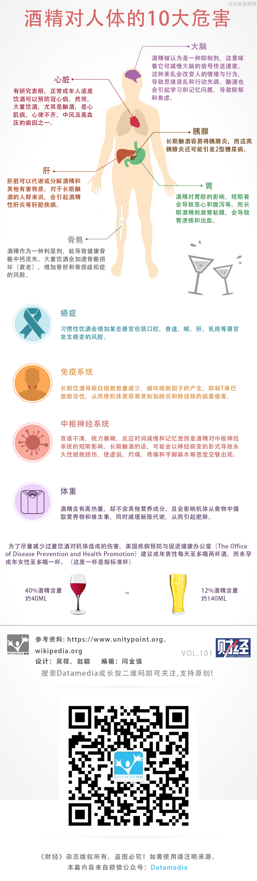 众所周知,酒精会对人体健康产生影响,而过量饮酒更会严重损害健康。那么,过量饮酒(不论是单次过量饮酒还是长期如此)会有哪些危害,对机体哪种器官造成影响呢?《财经》数媒为您解读。