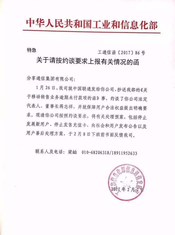 2月7日,工信部发函要求分享通信法定代表人、董事长蒋志祥按照约谈要求,将有关处理预案,包括停止发展新用户、停止发售充值卡、向社会和用户发布公告以及用户善后处理方案。
