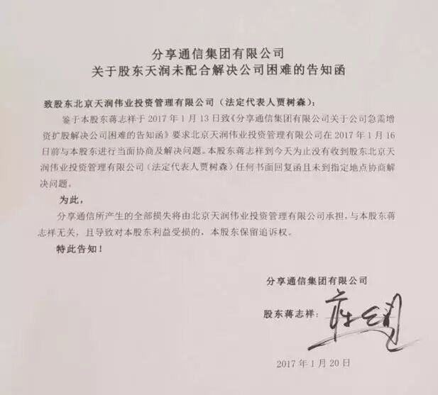 蒋志祥表示,尽管分享通信已经面临着很大的欠款压力,并且向天润伟业两次发出告知函,但由于增资扩股意见不同,天润伟业实际控制人贾树森自去年12月底开始一直避而不见,导致融资事且停顿,欠款无法及时偿还。