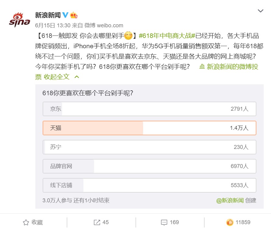 用户的消费习惯转移也得到第三方媒体力证!6月15日新浪新闻一项用户投票显示:今年618年中电商大战进入关键时刻,对用户是更喜欢去某电商平台还是天猫购买3C产品进行调研,最新数据显示,选择去天猫平台购买的用户数是某电商平台的5倍。足见用户购买3C产品的习惯已经转移到天猫!