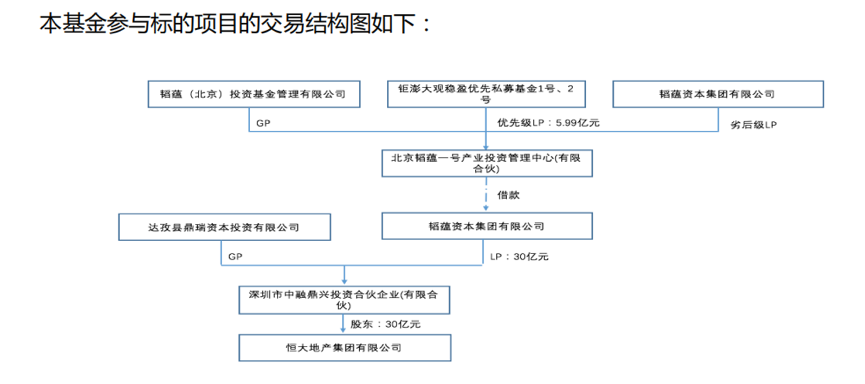 根据钜派集团给记者提供的交易结构层级图显示,韬蕴一号将资金出借给韬蕴集团,再由韬蕴集团出资30亿元作为唯一LP(即有限合伙人)入伙深圳市中融鼎兴投资合伙企业(有限合伙)(韬蕴集团持股比例100%)(下称“中融鼎兴”),达孜县鼎瑞资本投资有限公司(下称“达孜鼎瑞”)为中融鼎兴的GP(即普通合伙人),最终由中融鼎兴参与地产公司的借壳上市项目,并取得了地产公司一定的股份。