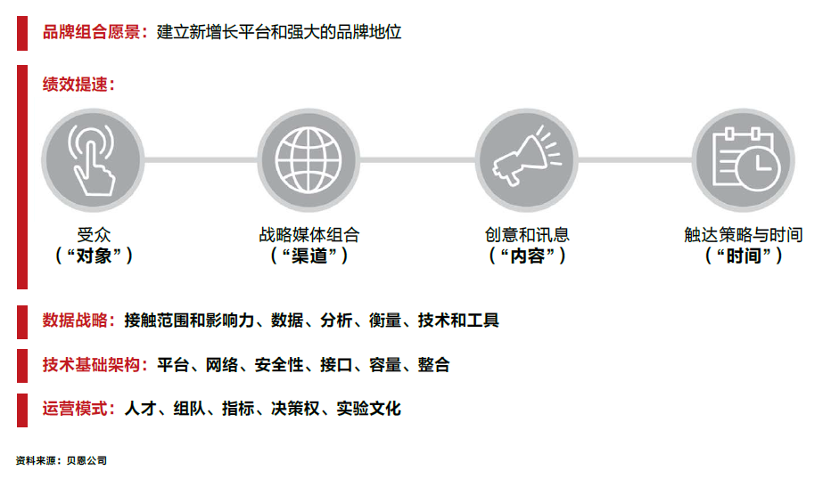 哪一条才是正确的路径?贝恩认为,品牌增长模式的重塑并非简单地将营销预算重新分配至数字化渠道。CMO需要重新评估增长平台和未来品牌组合,重新理解消费者旅程,利用数据和技术制定战略,并重新建立内部运营模式和外部合作关系。