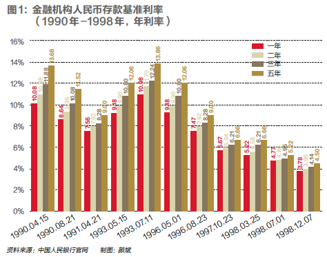 根据中国人民银行数据,1993年时一年期存款的利率就高达10%以上,三年期存款利率为12.24%(见图1)。彼时,高利率同步对应宏观经济周期的高通胀,为了吸引储户存款,银行甚至推出 “保值储蓄”,并加送大礼包。