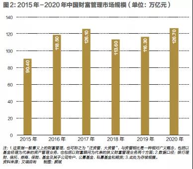 虽然在统计方式上有差异,但中国财富管理市场发展趋势亦基本与资管业务保持一致。据艾瑞咨询统计,自2015年以来,中国财富管理市场规模整体呈增长趋势,其中,2017年达到峰值126.1万亿元(见图2)。