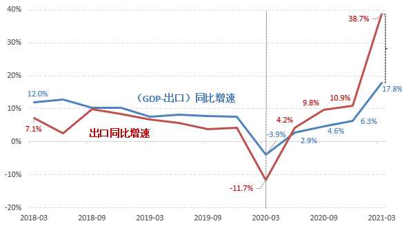 但是疫情冲击之后,外需经历短暂下行之后出现了强烈反弹。2020年二季度到2021年一季度,外需增速、内需增速差值越来越大。我们将出口作为外需、GDP减去出口值作为内需。2020年二季度,外需增速比内需增速高出1.3个百分点(4.2%减2.9%),2021年三季度两者差值扩大到20.9个百分点(38.7%减17.8%)。尽管上年的基期效应有一定解释力,但仍然难以完全解释这种内外需增速的背离。