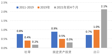 首先是社会消费品零售总额。该指标在2021年1月至4月的季调环比、实际增速平均值为0.2%,低于疫情之前的2019年平均值(0.4%),更低于有数据以来2011年至2019年的月度均值(0.8%)。其次是固定资产投资,其在三个时期的表现与前者完全一致。而出口增速则与前两者的表现形成了鲜明对比:2021年1月至4月的季调环比实际增速平均值为2.1%,大幅高于2019年的平均值(1.0%),更是高于2011年至2019年平均增速(0.7%)。