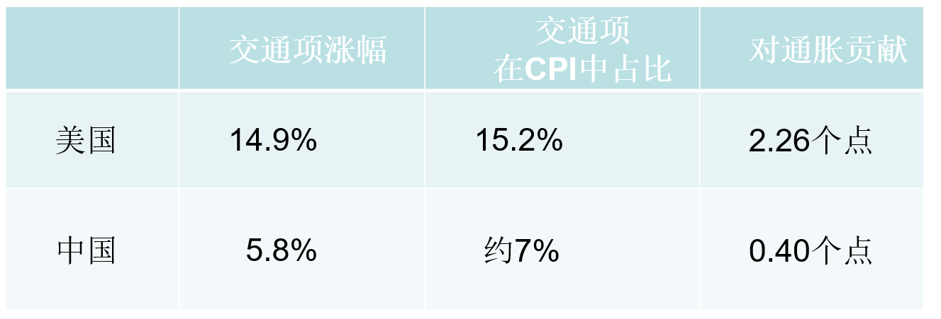 而中国的同口径交通项(剔除通信)占比约为7%左右,价格涨幅大约为5.8%,因此这一项仅贡献了中国CPI涨幅中的0.4个百分点。所以,仅交通项目一类就解释了中美之间通胀率分化的1.86个百分点。而且,美国的交通项目涨幅也可能具有一定的暂时性。