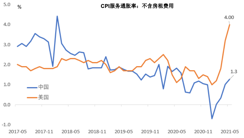 相较而言,中国的CPI服务项4月涨幅仅为0.7%,虽然与美国不含住房租金的口径不完全匹配,但也可以看到中美服务类价格涨幅存在显著差异。这项大约解释了中美之间通胀率0.5个百分点的差异。而且,随着前文提到美国救助个人的政策在9月到期后大概率将停止。因此这方面的因素也将使得美国的劳动参与率有所上升,并起到压低服务类价格涨幅的作用。因为对个人救助的方式存在差异,因此中国在这方面的物价压力较美国更小。