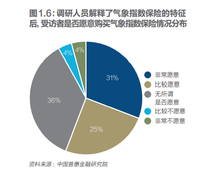 在受访样本中,起初仅有35%的农户听说过气象指数保险产品,但是对其并不了解,大多表示不会购买。但当调研人员向受访农户详细解释气象指数产品的保障和理赔方式后,约56%的受访者表示愿意购买这种保险产品,61%的受访者认为气象指数保险可以作为已有的传统农业保险产品的有效补充。