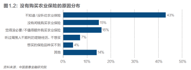 调研数据显示,约半数农户没有购买农业保险(图1.1),对于其未购买农业保险的原因,43%的受访农户表示没有听说过农业保险(图1.2)。当调研人员向这些没有听说过农业保险的农户解释农业保险的内容和作用时,大多数农户表示愿意购买。由此可以看出,很多农村地区农业保险的宣传工作还非常匮乏,农户缺乏充分了解农业保险保障功能的渠道或主动去了解农业保险的意识。