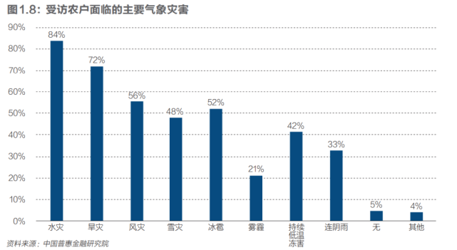 气象灾害是农户面临的主要风险之一。调研数据显示,95%的受访者都不同程度地因为气象灾害遭受过损失。面临的气象灾害因不同地域会有所差别,主要包括水灾(84%)、旱灾(72%)、冰雹(52%)、风灾(56%)、雪灾(48%)和持续低温冻害(42%)(图1.8)。
