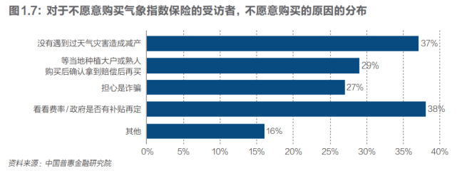 气象指数保险产品知识的普及面较窄,但是潜在需求较大。受访样本中,仅35%的农户听说过气象指数保险产品,潜在保户对这种新型产品的知识了解很少,在一定程度上妨碍了其对产品的接受度。当调研人员向受访农户详细解释气象指数产品的具体内容时,56%的受访者表示愿意购买这种保险产品,仅8%的农户表示不愿意购买,其余农户不确定是否购买(图1.6)。对于不愿购买的原因,主要是“费率不确定”(38%)以及“没有因为气象灾害造成过减产”(37%)(图1.7)。由此可见,气象指数保险的潜在需求较大,但是需要保险公司、政府和社会培训机构大力宣传和普及相关知识。