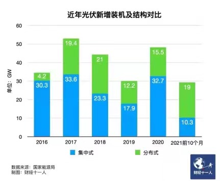 2021年1月-10月,分布式装机19GW,占同期总装机约65%,其中户用同比增长106%至13.6GW,为新增装机的主要来源。