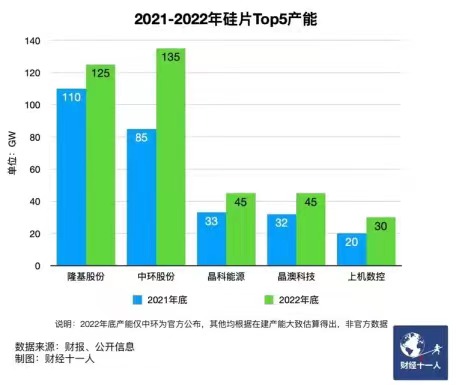 硅业分会根据各主要企业的规划进行初步统计,2022年底,国内多晶硅产能为85万吨/年,考虑到海外产能供应,可满足230GW的装机需求。据《财经》记者不完全统计与推算,2022年底仅Top5硅片企业就将新增约100GW产能,硅片总产能近500GW。