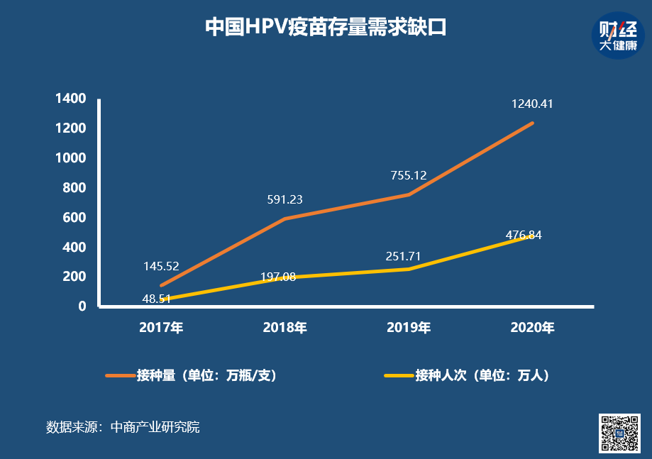 根据前瞻经济学人2021年统计,自HPV疫苗在国内上市以来,累积接种人次在974万人左右。每年还有大量女孩儿加入适龄人群,2020年公安系统登记的新生女孩儿就有474.5万人。