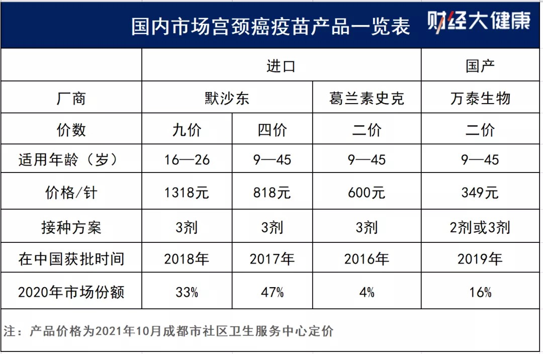 国内市场上,有默沙东手握的九价、四价疫苗,葛兰素史克、万泰生物的二价疫苗。