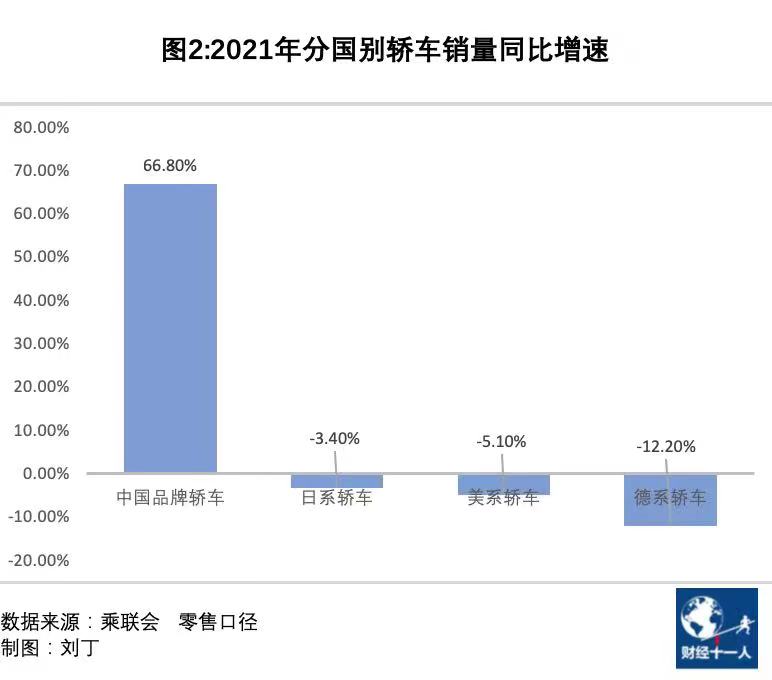 而2021年市占率提升,则来自于轿车市场的突破。根据乘联会统计的市场零售数据,中国品牌轿车销量2021年同比大幅度提升了66.8%,而日德美系轿车则均出现下滑。
