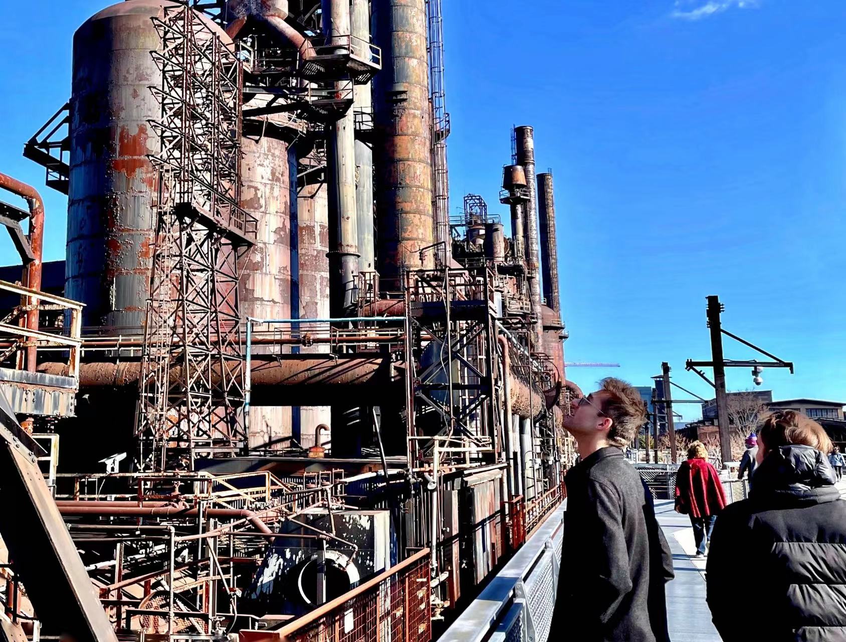 《美国竞争法》被推崇为支持美国制造业和劳工的经济的法案。图为美国人站在美国最大的废弃工业宗地伯利恒炼钢厂的废墟前。摄/《财经》记者金焱