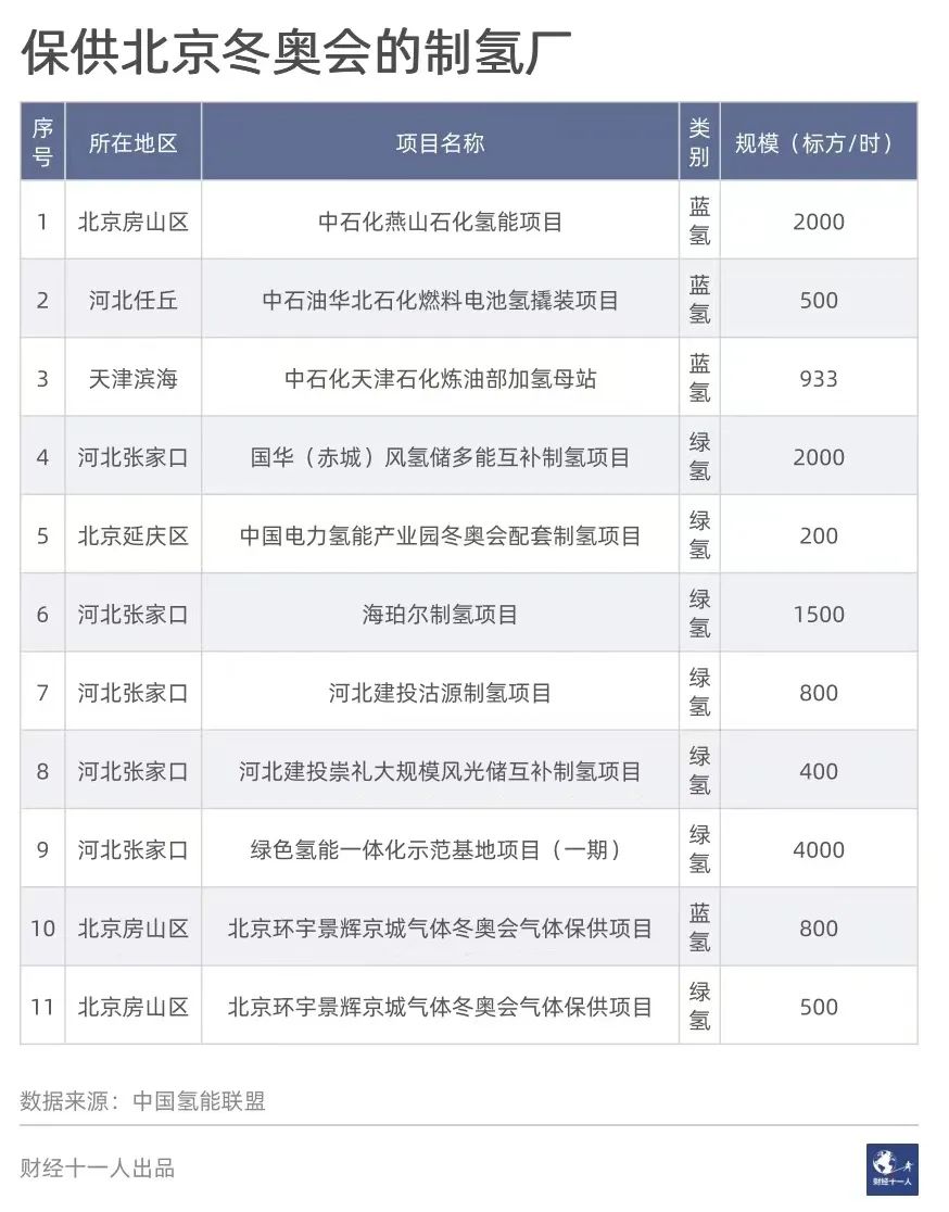 此次冬奥会期间,北京和北京周边共有11座制氢厂投入保供。其中,规模最大的两座制氢厂是张家口绿色氢能一体化示范基地项目(下称“张家口绿氢项目”)和中石化燕山石化北京冬奥会氢气新能源项目(下称“燕山石化氢能项目”),产品分别为绿氢和蓝氢。