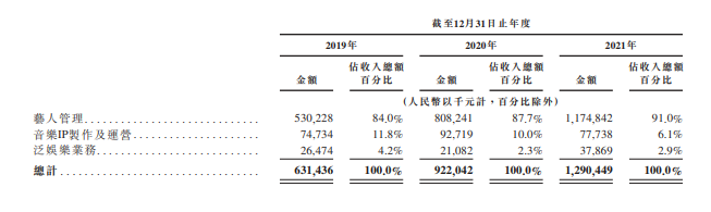 据招股书显示,乐华娱乐目前拥有58名签约艺人及80名参与训练生计划的训练生。而来自艺人管理的收入则分别占到2019年总营收的84%、2020年总收入的87.7%,在2021年,这个数据更是攀升到了91%。