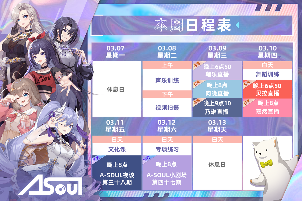在A-SOUL的设定里,这个虚拟女团也会像真人一样参加各类训练,排布日程。粉丝也可以透过各类直播看到虚拟偶像的训练场景