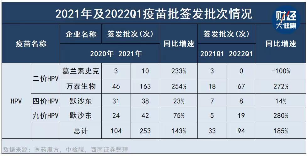 2022年的批签发量仍在增加。据华西证券3月的一份研报,根据中检院披露数据,截至2022年3月15日,四价HPV疫苗批签发12批次,推测约为200-250万支;九价HPV疫苗批签发20批次,推测约为400-450万支。预计2022年第一季度四价和九价整体批签发约600-799万支,同比去年增长100%-130%。