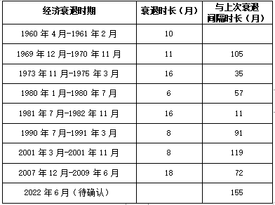 1960年以来的50多年中,剔除疫情冲击,美国已经发生过8轮全面衰退。这些衰退间隔时长平均为70个月,即6年不到。其中最小间隔11个月,最大间隔119个月。