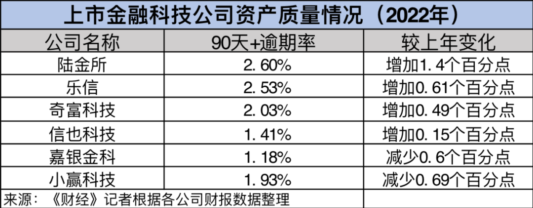 财报数据显示,与2021年对比,部分金融科技公司贷款90天以上逾期率有所抬升。