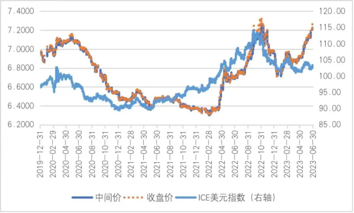 迄今为止,人民币走势印证了去年底笔者的三个预判。一是虽然不能说人民币走弱与美联储紧缩预期反复、美元指数震荡无关,但相关性明显减弱。对滞后1期的人民币汇率中间价与洲际交易所(ICE)美元指数分别取自然对数后的相关性分析结果显示:去年全年,二者为强正相关,相关系数为0.898;今年上半年,二者为弱正相关,相关系数仅为0.229。真实情况是,今年上半年,美元指数有涨有跌,累计下跌0.1%,同期境内人民币汇率下跌了4%左右(见图1)。