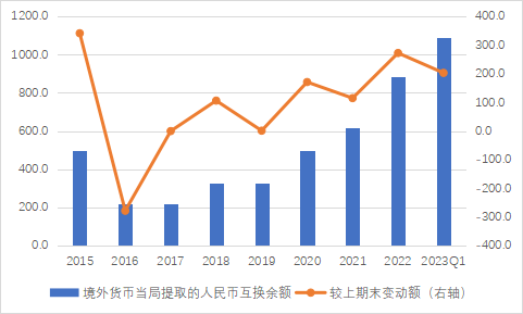 图5:境外货币当局在与人民银行签署的双边本币互换协议下动用的人民币余额及其变动(单位:亿元人民币)