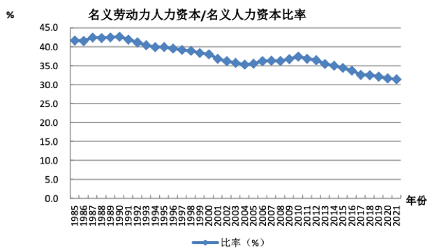 图:“全国名义总劳动力人力资本与名义总人力资本的比率”变化(1985年-2021年)
