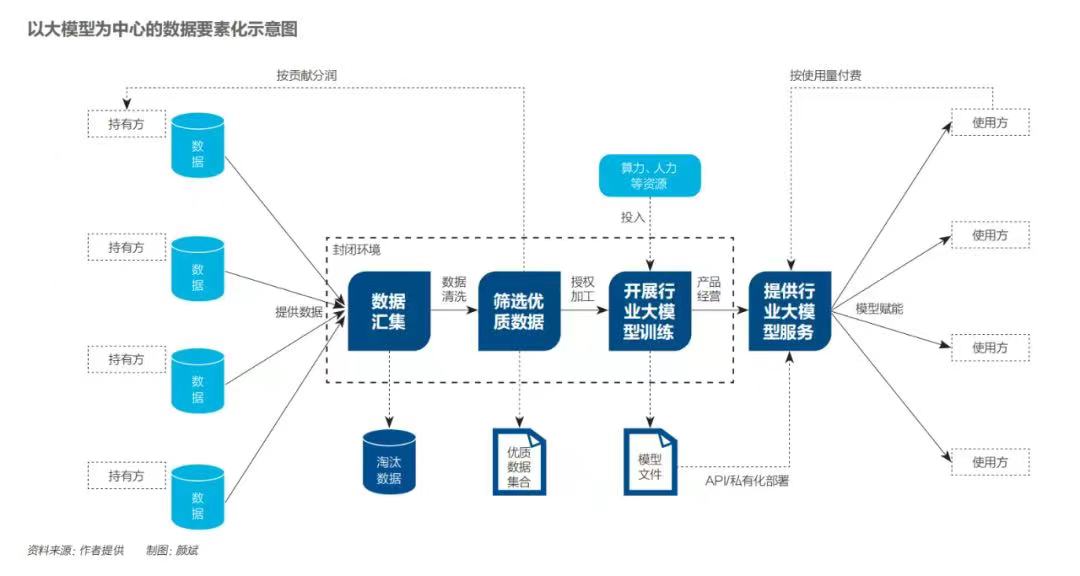 笔者将“以大模型为中信的数据要素化”流程制作成了一张图表,如上图所示,可以有效落实《关于构建数据基础制度更好发挥数据要素作用的意见》中发挥数据要素作用,赋能实体经济等目标,以及数据要素收益分配制度中“谁投入、谁贡献、谁受益”的原则,有效化解数据要素化中的主要问题。