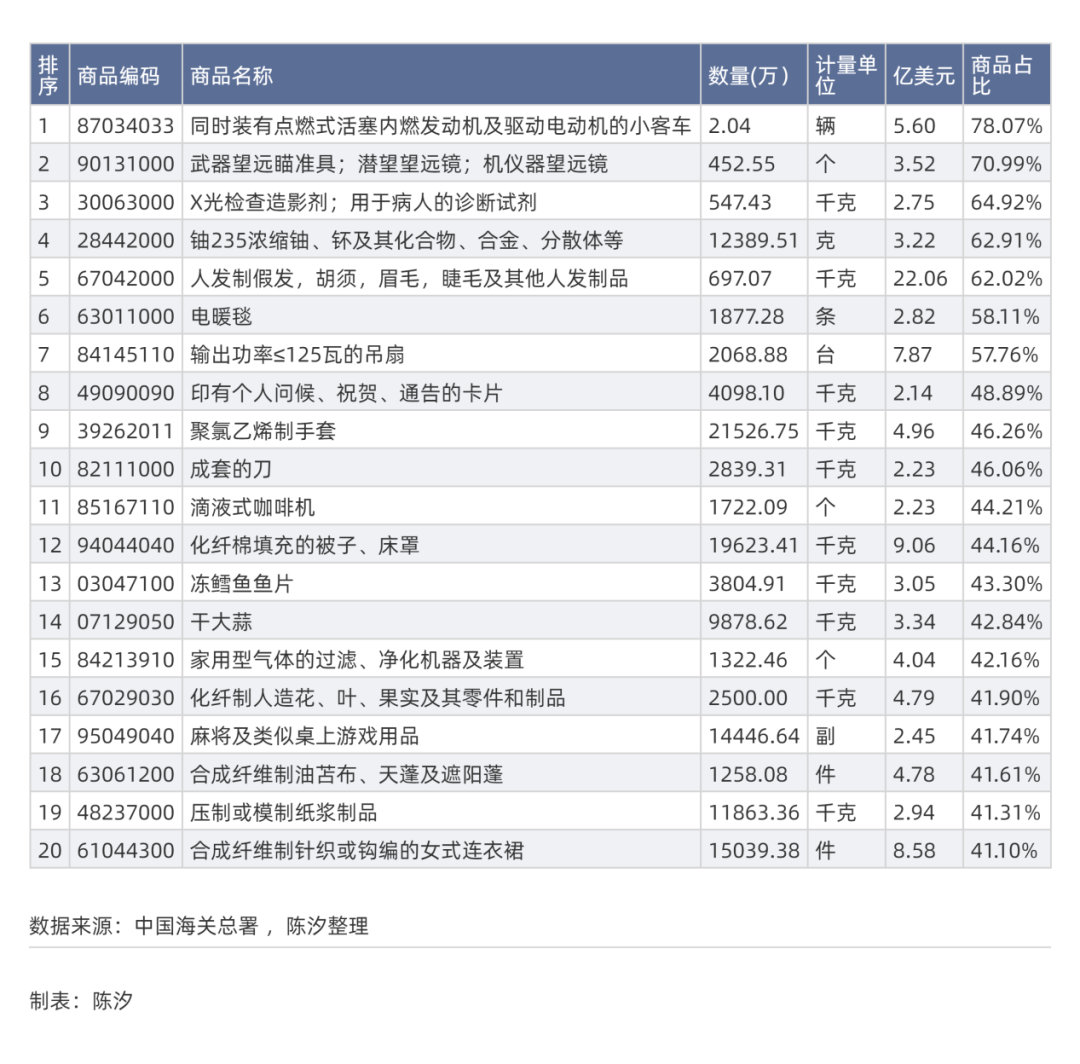 表4是2024年出口金额大于2亿美元的商品中,“对美占比”最高的20种商品。