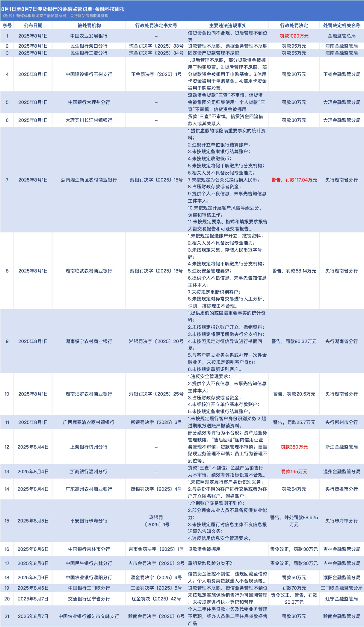 8月1日至8月7日,央行、国家金融监督管理总局官网披露21张涉及银行的罚单。其中,被罚金额最大的是中国农业发展银行,其因“信贷资金投向不合规、贷后管理不到位等”被金融监管总局罚款1020万元。