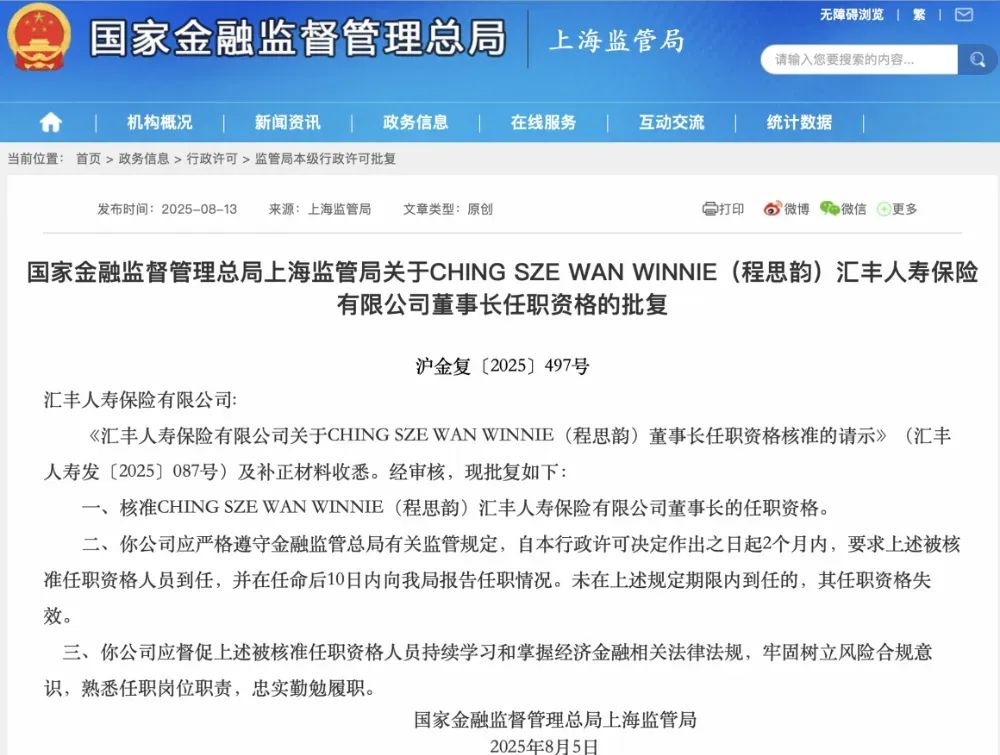 8月13日,国家金融监督管理总局(下称“金融监管总局”)上海监管局官网发布批复信息显示,核准CHING SZE WAN WINNIE(程思韵)汇丰人寿保险有限公司(下称“汇丰人寿”)董事长的任职资格。