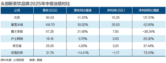 2025年中报显示,蜜雪冰城及古茗仍能实现营收及净利润的较快增长,其中蜜雪冰城2025年上半年营收增长39.32%至148.7亿元,归母净利润增长42.9%至26.93亿元;古茗2025年上半年营收增长41.24%至56.63亿元,归母净利润增长121.51%至16.25亿元。霸王茶姬则由于单店销售额下滑,业绩出现放缓,其2025年上半年营收增速由2024年同期的381.11%降至21.6%,净利润增速则由2024年同期的533.41%降至-38.34%。沪上阿姨、茶百道、奈雪的茶业绩增长仍然相对缓慢。