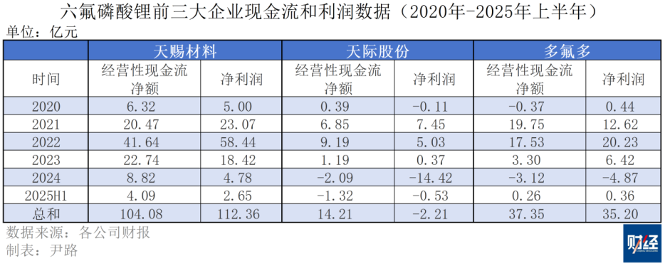 以行业龙头天赐材料为例,在2020年到2025上半年的统计周期内,累计实现净利润112.36亿元,经营性现金流净额104.08亿元。天际股份同期累计净利润亏损,但其现金流净额却超过14亿元,亏损主要来自2024年一笔超过10亿元的商誉减值。