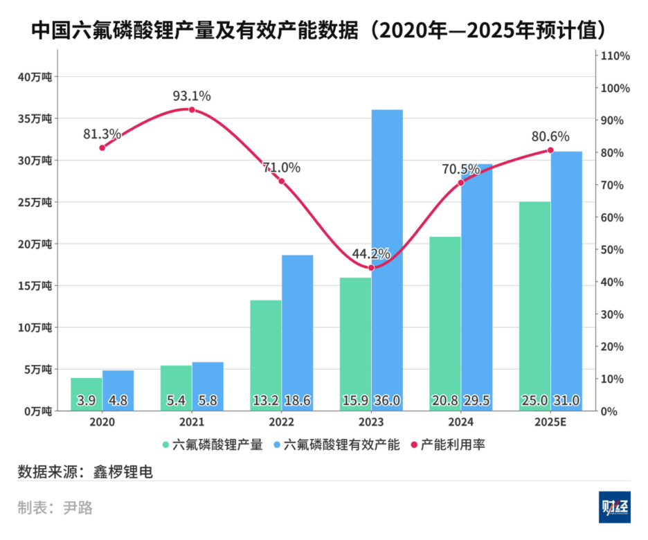 因前期过度扩张,2023年六氟磷酸锂行业产能利用率降至44.2%的低点。残酷的价格战迫使部分工艺老旧、成本较高的产线停产出清。进入2024年,随着市场供需关系逐步修复,产能利用率恢复至70.5%的相对健康水平。至2025年,在新能源汽车和储能市场需求的共同增长下,预计将带动全年行业产能利用率提升至80.6%的水平。