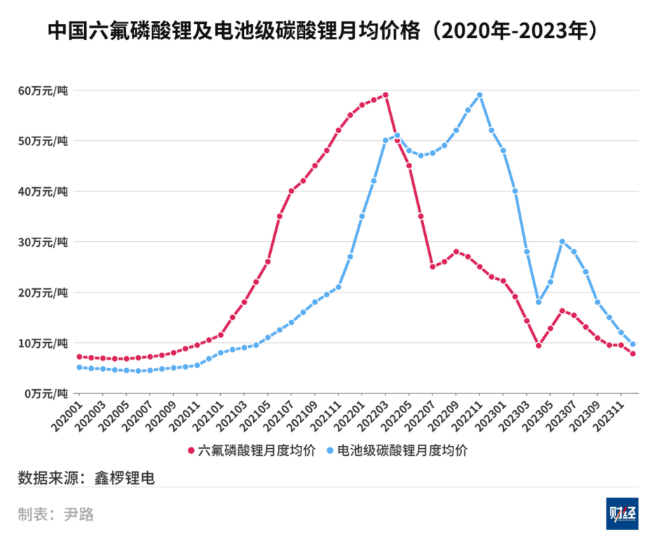 回顾上一轮周期,从2020年下半年开始,六氟磷酸锂与电池级碳酸锂价格先后启动上涨。二者在随后的两年时间里,呈现出高度相似的波动曲线,均在2022年内达到近60万元/吨的高点。此后随着大量新建产能投产,供需关系逆转,价格快速回落,整个行业进入了漫长的去库存和价格下行阶段。