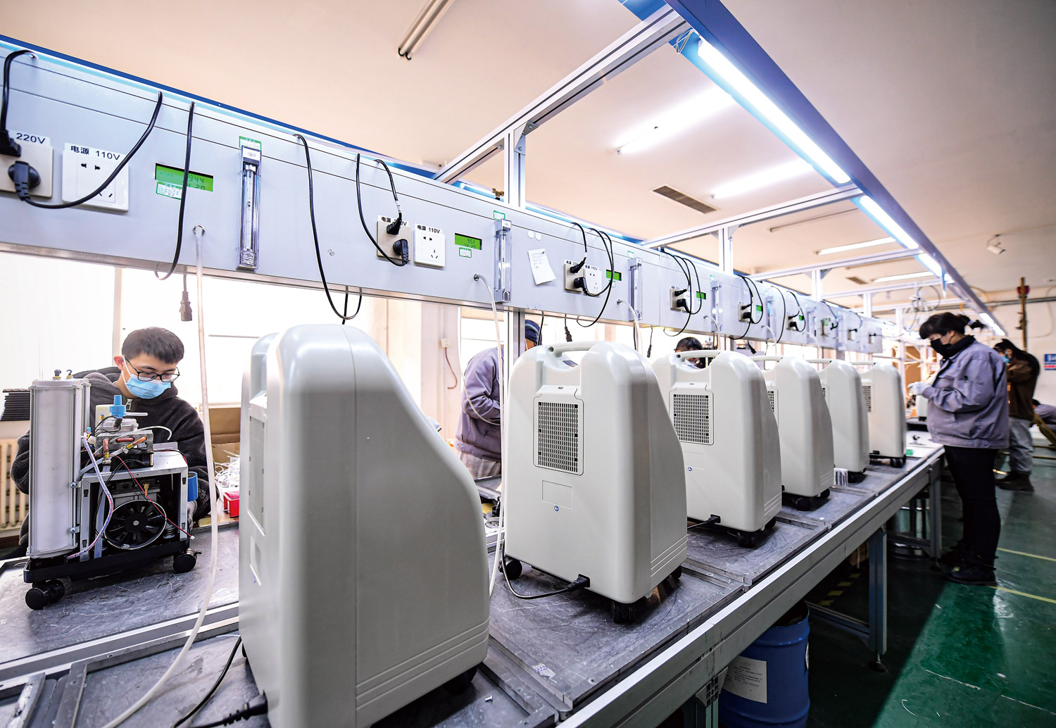 制氧机生产线。动辄几千、上万元的家用医疗器械,用过后只能闲置在家,而租用则显得既经济又方便。图/视觉中国