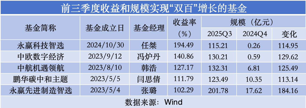 部分基金甚至实现了“双百”增长,不仅收益翻倍,规模增长也超过百亿。比如,任桀管理的永赢科技智选,前三季度以194.49%的业绩涨幅位列第一,规模从去年底的2609.49万元增至115.21亿元。冯炉丹管理的中欧数字经济,前三季度以140.86%的业绩涨幅位列第三,规模从去年底的5935.66万元增至130.21亿元。