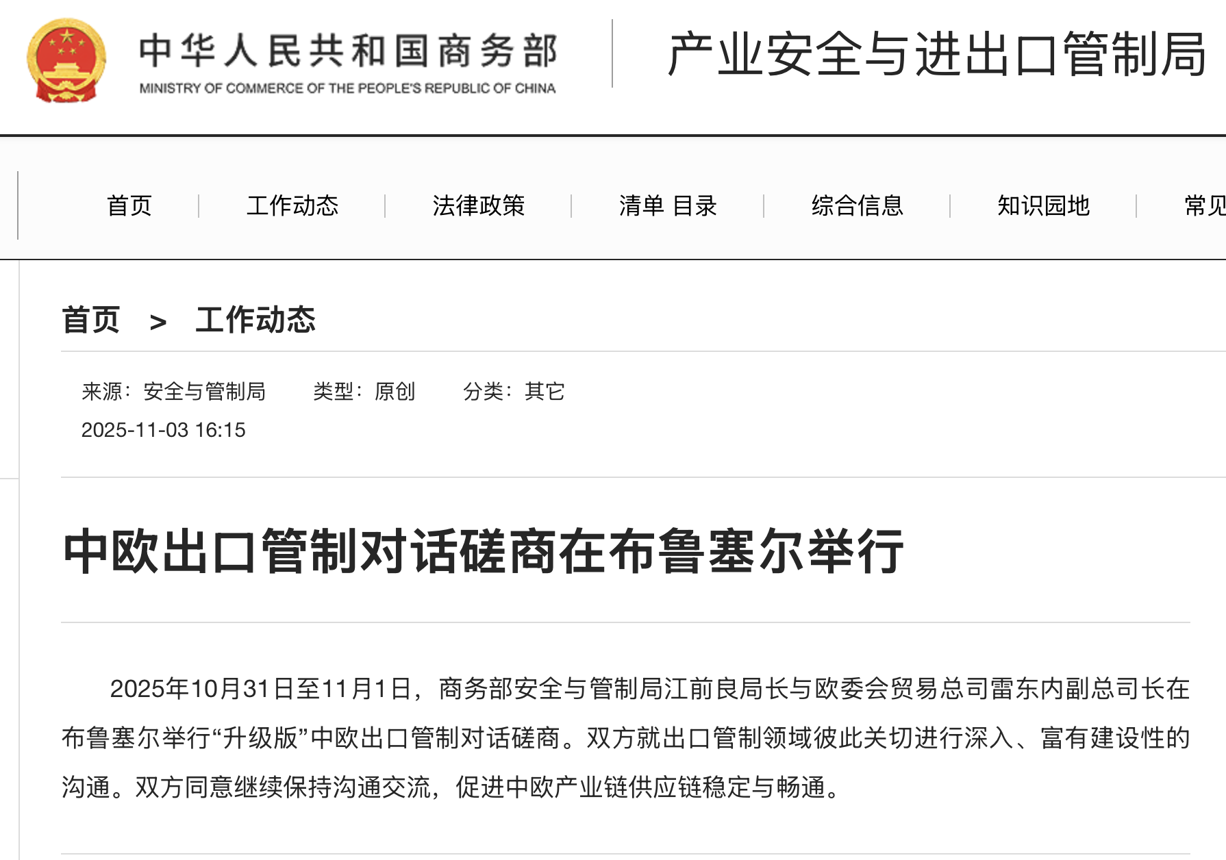 2025年10月31日至11月1日,商务部安全与管制局江前良局长与欧委会贸易总司雷东内副总司长在布鲁塞尔举行“升级版”中欧出口管制对话磋商。双方就出口管制领域彼此关切进行深入、富有建设性的沟通。双方同意继续保持沟通交流,促进中欧产业链供应链稳定与畅通。