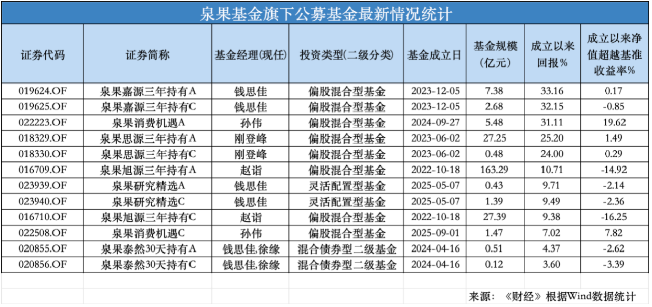 此外,《财经》根据Wind(万得)数据统计,泉果基金旗下公募产品目前已全部实现正收益。其中,钱思佳管理的泉果嘉源三年持有A自2023年12月成立以来回报达33.16%,超越基准0.17%。孙伟管理的泉果消费机遇A自2024年9月成立以来实现31.11%的业绩,超越基准19.61%。赵诣管理的泉果旭源三年持有期基金也在近期回到发行价之上,目前收益9.38%,不过仍跑输基准16.25%。