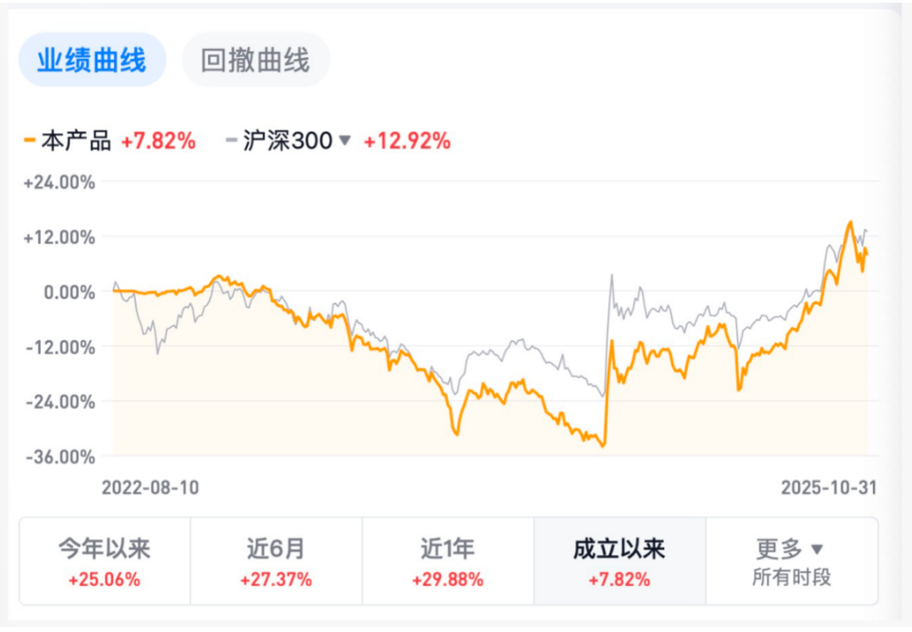雪球数据显示,截至10月31日,最新净值为1.0783元,累计收益7.82%。成立以来最大回撤36%,今年以来收益25%。夏普比率0.04,属中高风险“主观股多”策略。