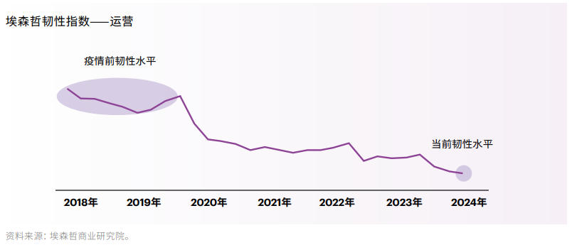 面对着当前充满不确定性的全球经济环境,运营韧性从未如此重要,也从未如此脆弱。我们的韧性指数显示,与新冠疫情暴发前相比,企业的运营韧性水平呈现持续下行趋势(见图八)。对许多企业而言,其弱点具有结构性特征。它们的全球布局看似多元化,却常常缺乏真正灵活可调的运营能力——难以通过实时模式切换、供应链动态重组及资源弹性配置,有效应对突发性冲击。这种系统性重塑能力,已成为构建新一代运营韧性的关键基准,也是众多企业在奋力追求的目标。