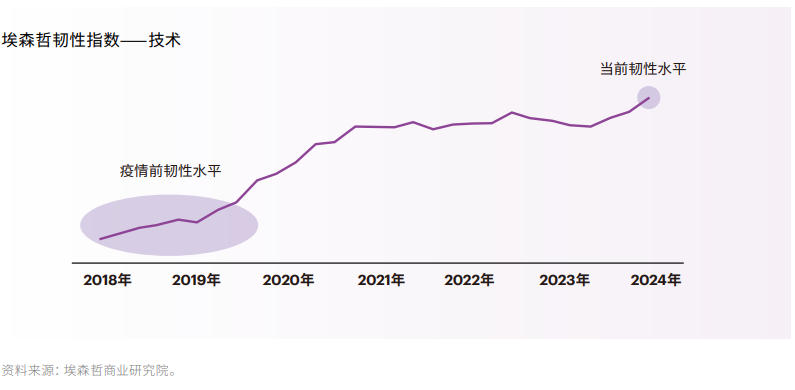 为了应对持续涌现的挑战,企业领导纷纷采取果断行动,从加固网络安全到升级数据基础设施,全面加强风险防控体系。表面看来,这些举措似乎已见成效——埃森哲韧性指数显示,受访企业的整体韧性分值已回升至新冠疫情以来的最高点(见图一)。然而,我们是否真的具备了面对未来冲击的能力?