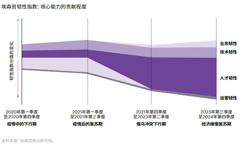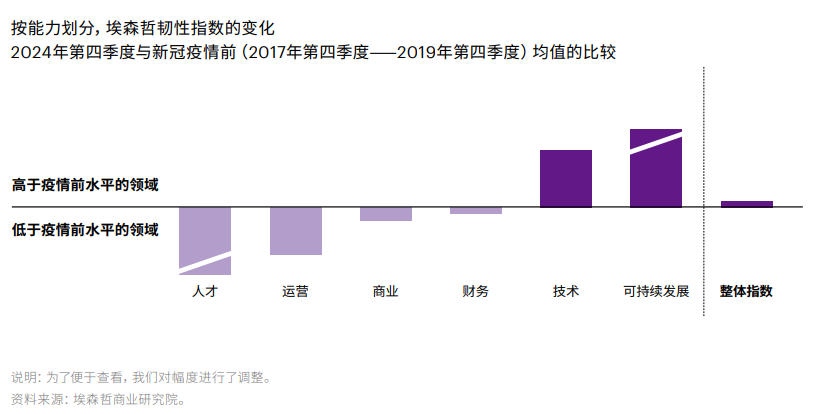 我们明确了四项在颠覆时期能够最直接推动企业韧性的核心能力:技术、业务、人才和运营。当前,最突出的薄弱环节集中体现在人才和运营方面,而这两者正是适应力与执行力的重要基础(见图四)。