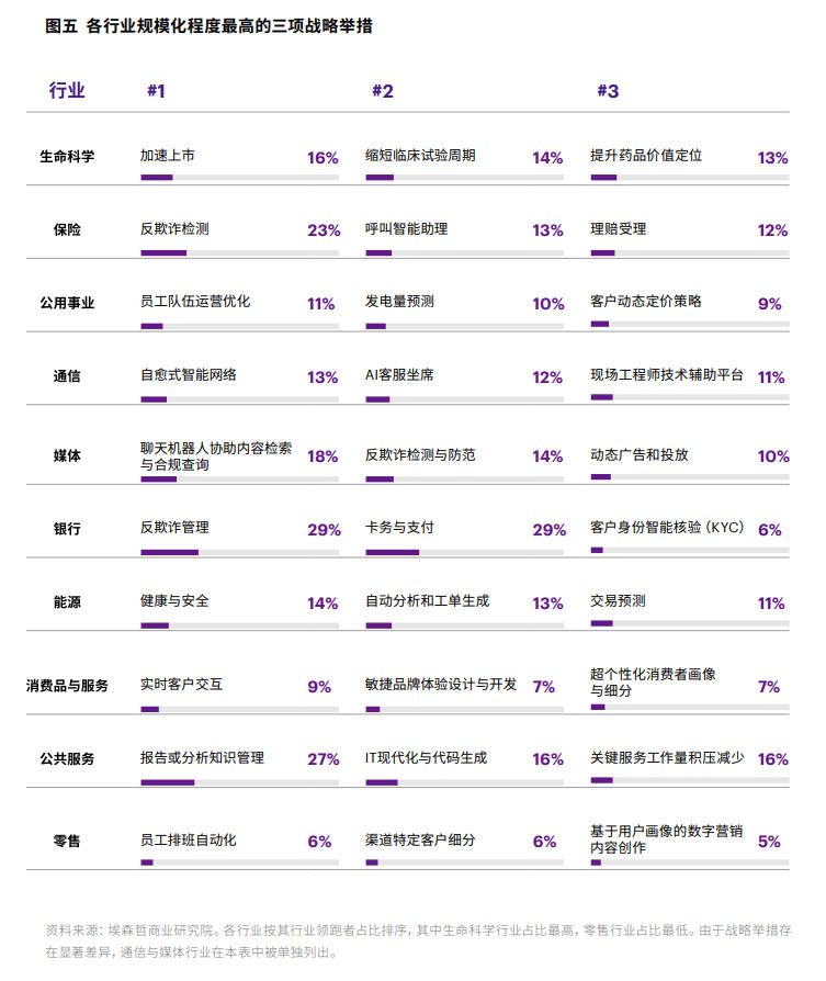 在行业层面,AI的规模化应用呈现出差异化格局(见图四),其中,生命科学、金融是AI规模化应用的领跑者。聚焦各行业规模化程度最高的三项战略举措,我们发现AI应用正逐渐从“降本增效”迈向“模式创新”(见图五)。例如,生命科学行业重点突破的“提升药品价值定位”和消费品与服务行业的“超个性化消费者画像与细分”场景。一旦潜能尽释,这样的AI应用将成为驱动企业系统性变革的核心力量。