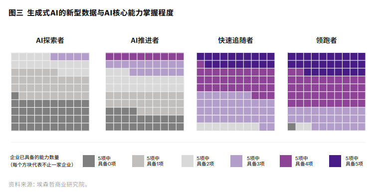 能力层面:我们发现,领跑者在生成式AI新型数据与AI核心能力上具有明显优势,28%的领跑者同时具备五项新型能力,而快速追随者中这一比例仅为19%(见图三)。