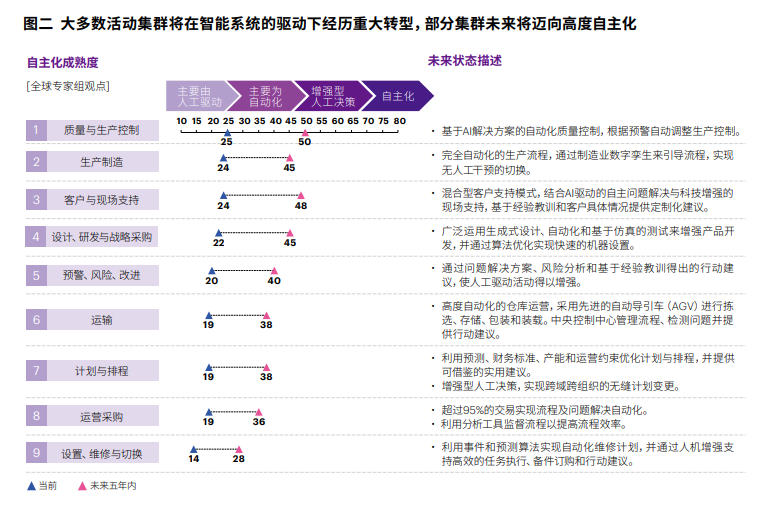 最终,“生产制造”集群有望达到最高水平的自主化成熟度,这得益于诸如“黑灯工厂”等最新创新成果——这类工厂运用机器人技术与先进的增材制造技术,快速生产定制化产品。紧随其后的将是“质量与生产控制”和“客户与现场支持”等集群,在这些领域,物流企业正部署自主无人机和数字助理,以加快响应速度并提升服务质量。
